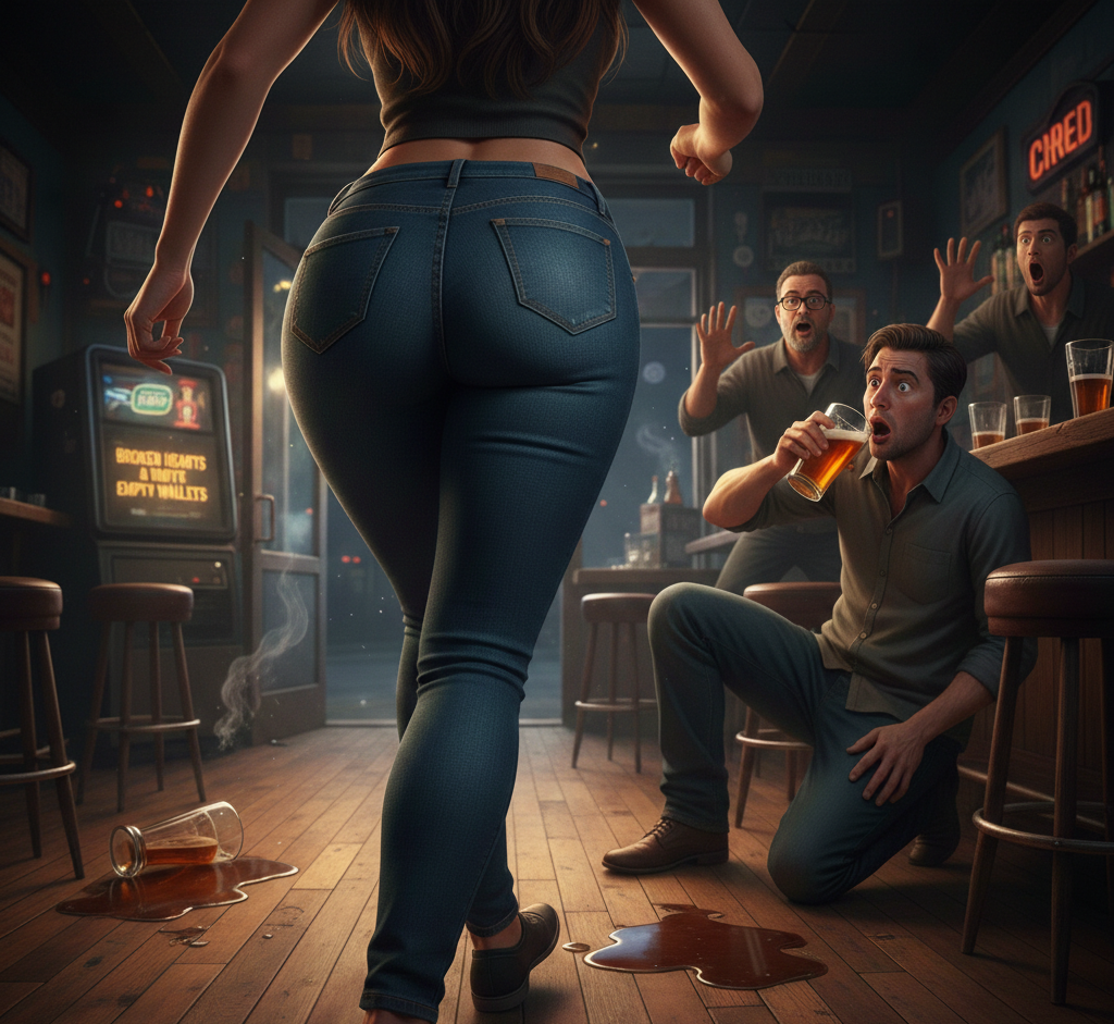 She caught the stare of one poor bastard nursing a warm IPA and a grudge against optimism. He froze, glass halfway to lips, eyes locked on the impossible physics of it all, the way the denim strained and surrendered in equal measure, the rounded flare catching the low neon like a signal flare from some distant, more honest civilization. He tried to look away – failed spectacularly – then tried again, this time with the doomed concentration of a man attempting to defuse his own libido using only willpower and bad posture. The ass didn’t care. It just kept moving, broad and rounded and utterly indifferent to the wreckage it left behind: one spilled drink, two dropped jaws, and a suddenly very expensive tab because nobody could remember how to signal for the check.